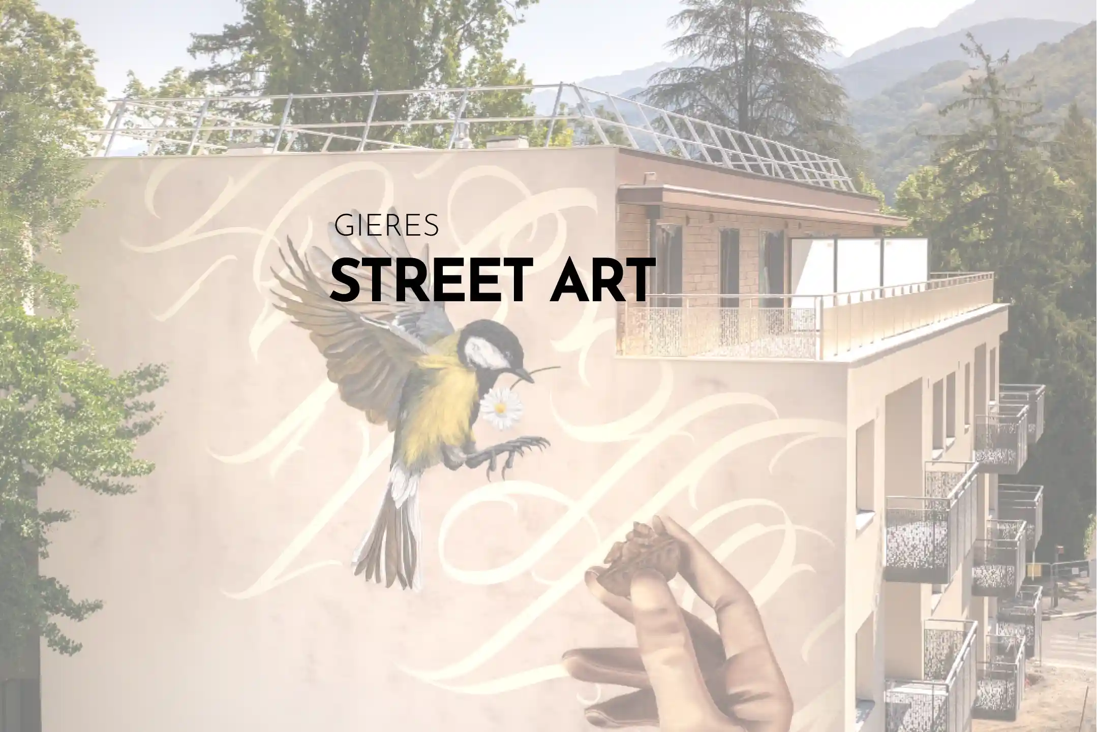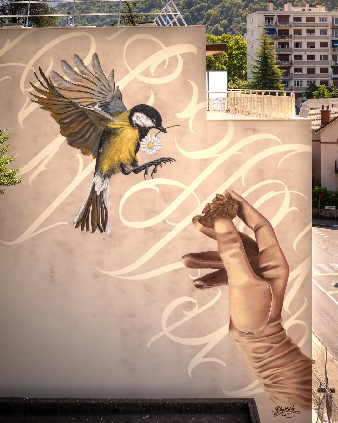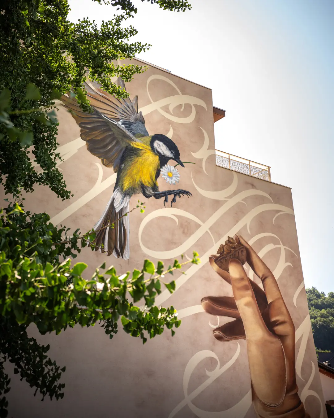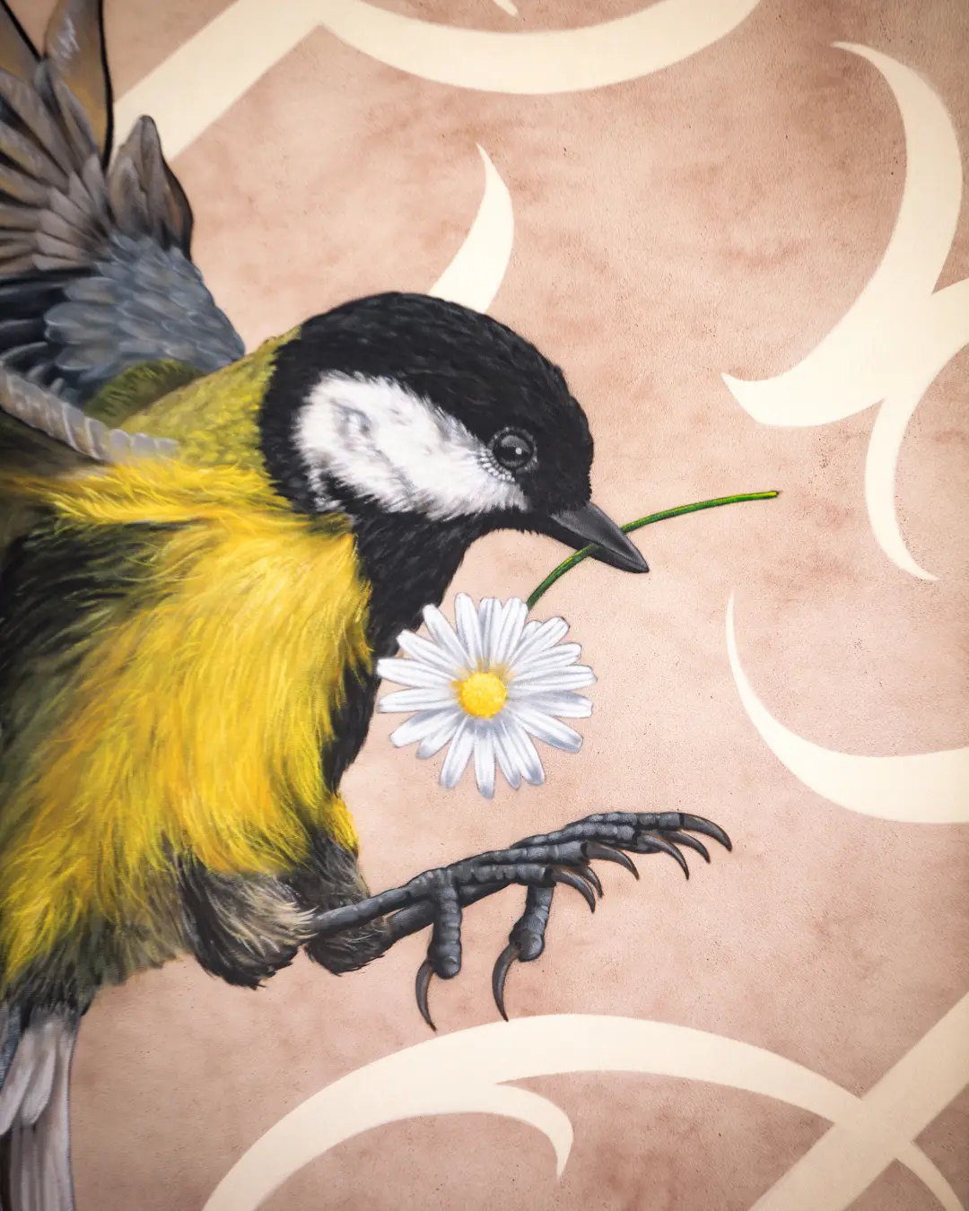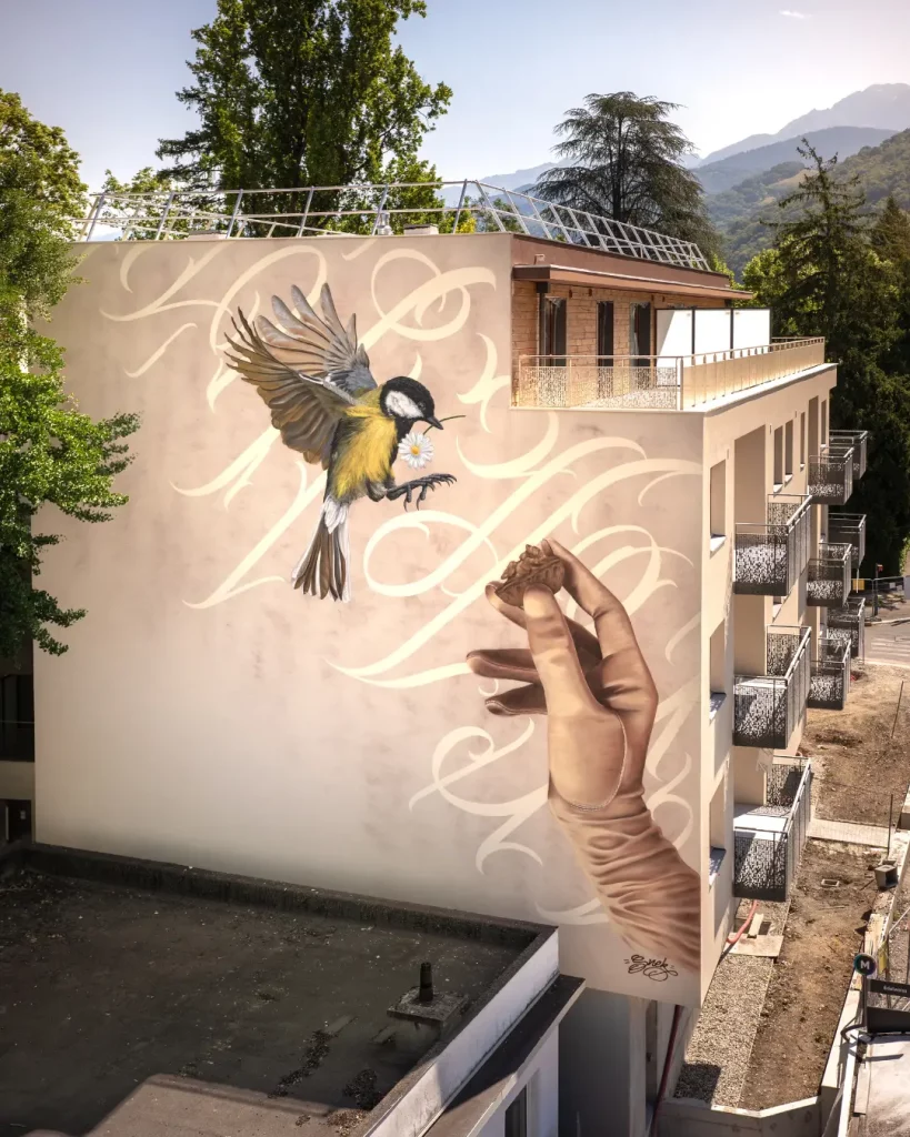 Sur la fresque la mésange offrant une pâquerette à l’humain, symbolise l’importance et le rôle inconscient de la faune et la flore dans nos vies.